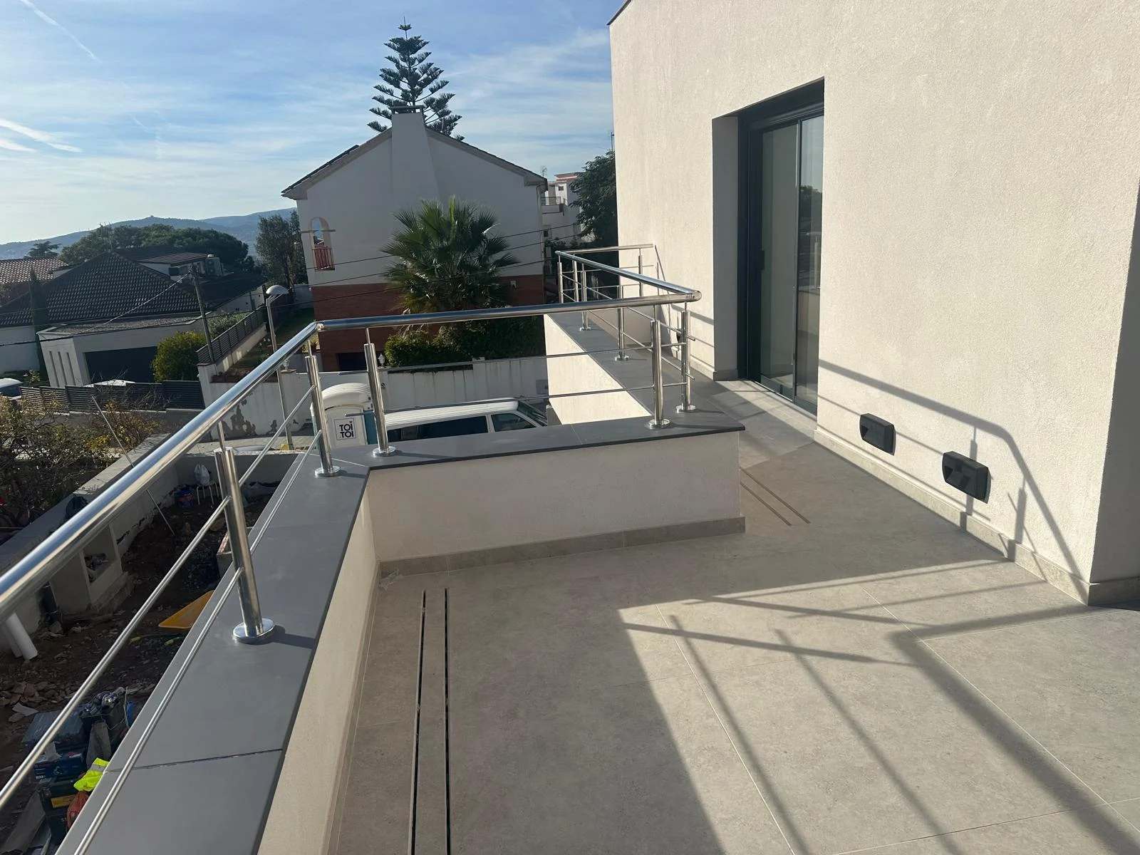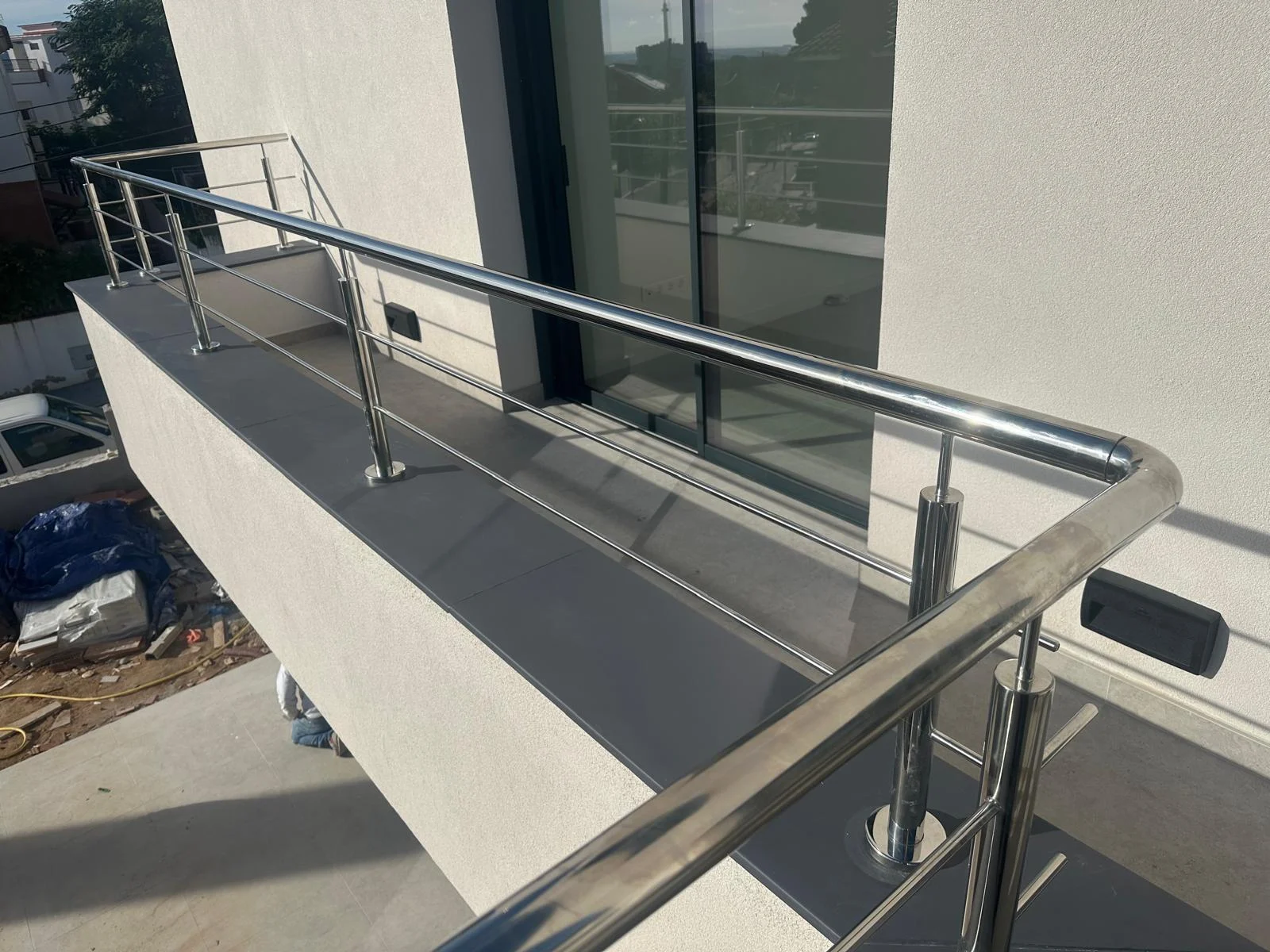 Fabricación e instalación de una moderna barandilla de acero inoxidable pulida en la terraza de la primera planta de una vivienda. El diseño limpio con tubos redondos y anclajes visibles aporta seguridad sin comprometer la estética del entorno. Una solución minimalista pero que aporta carácter y elegancia al diseño exterior de la casa.